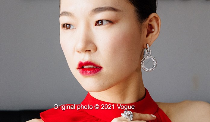 Ms. Han used two tones of red lipstick, applying the Chanel Rouge Coco Bloom Colour in Magic on the full lip combined with the Rouge Coco Bloom Color in Vitalité for a soft outer lip blurry edge.
